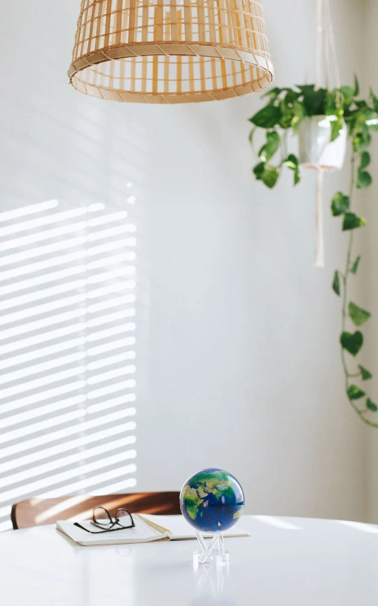 在這款寧靜的 Earth MOVA Globe 上,地球的自然美景以藍色和綠色的輻射色調呈現。