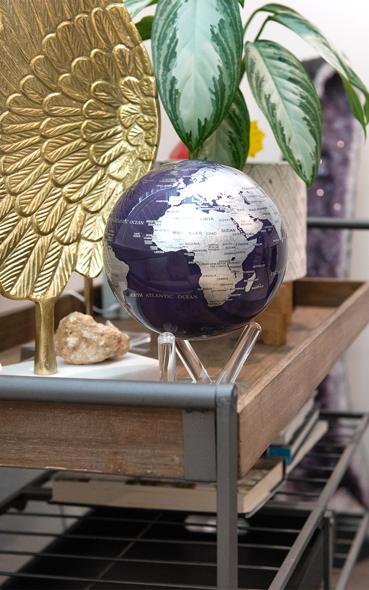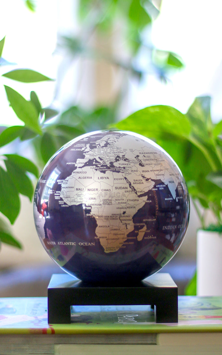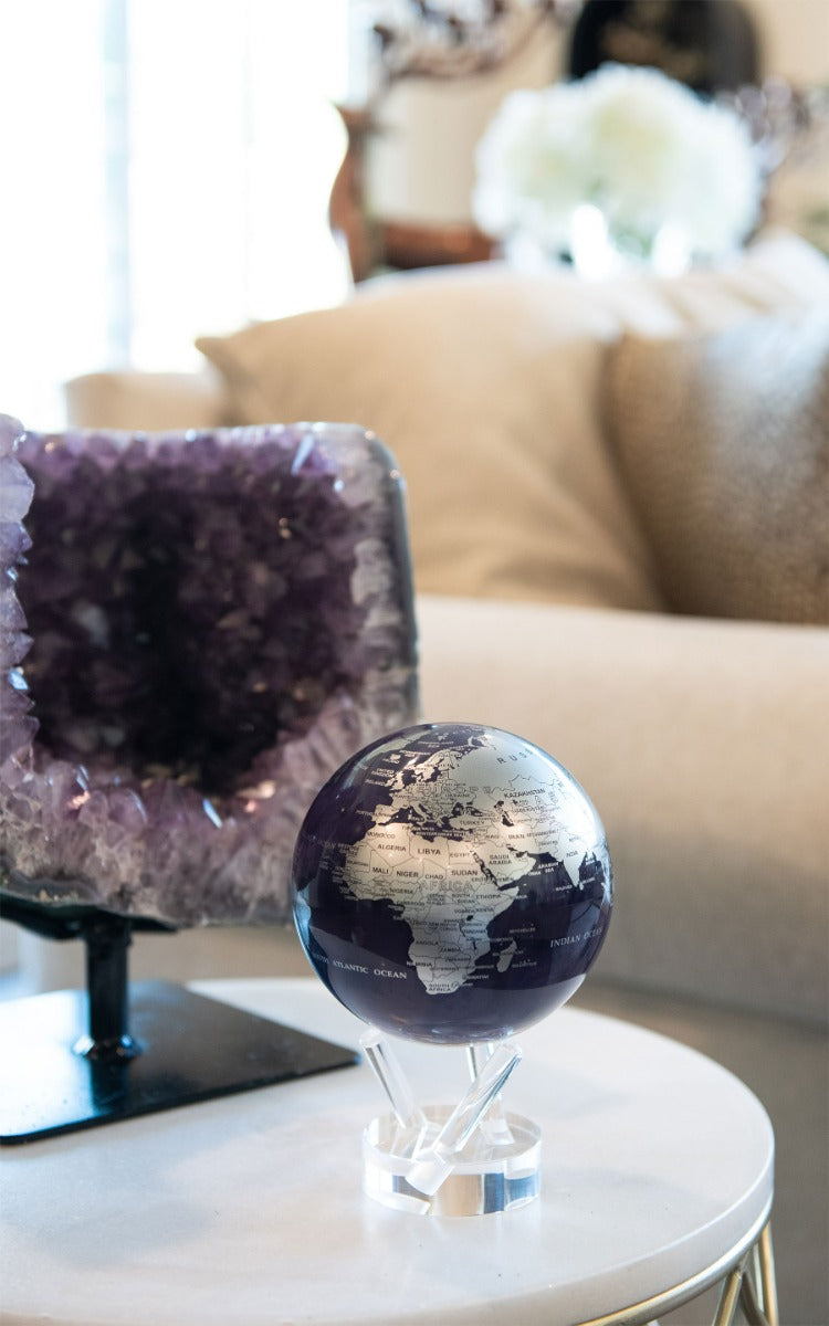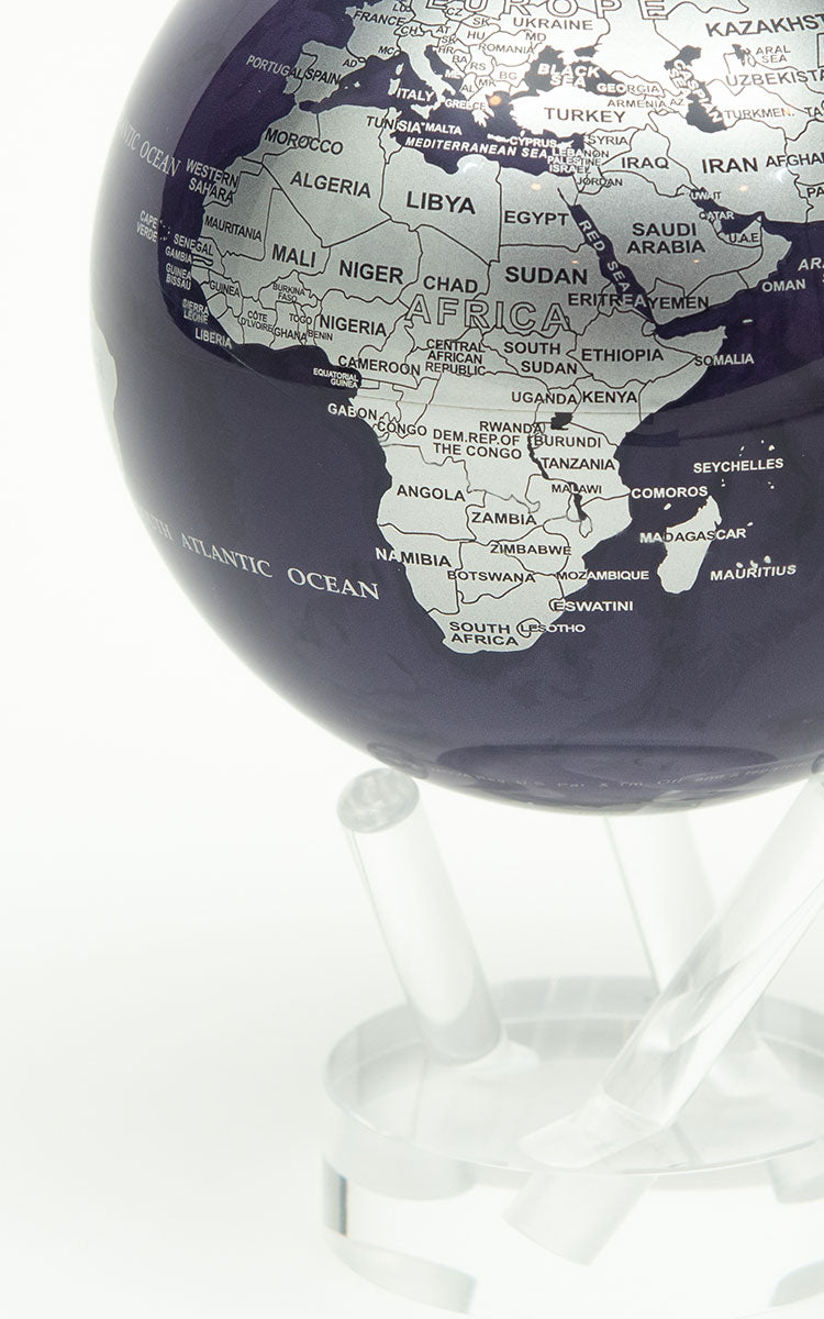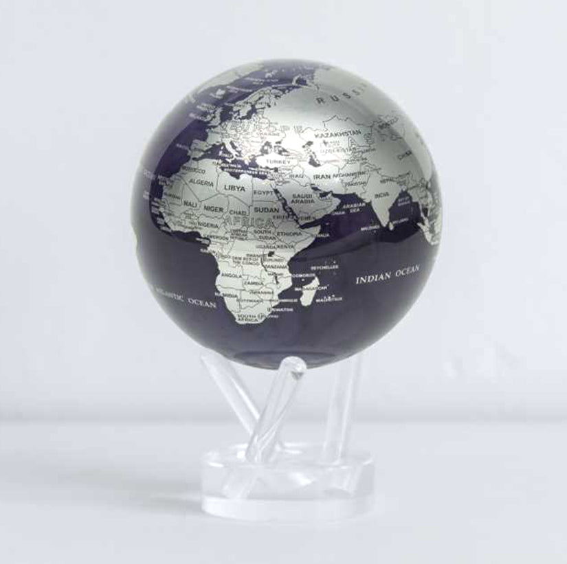 紫銀地球儀具有與傳統地球儀不同的獨特功能:它繞著軸優雅旋轉。這項創新技術由環境光供電,無需電池或外部電源即可旋轉地球儀。敬畏地觀看地球儀輕輕旋轉,為任何空間增添一抹活力和魅力。
